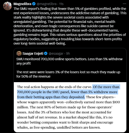 Alright we leave you with one last thing and it has to do with gambling in today’s society, we commented on X yesterday about this. SMU monitored 700k online bettors and noted that an astonishing 5% withdrew any profit, with 3% of the losers accounting for 50% of the revenue! This was our reply: