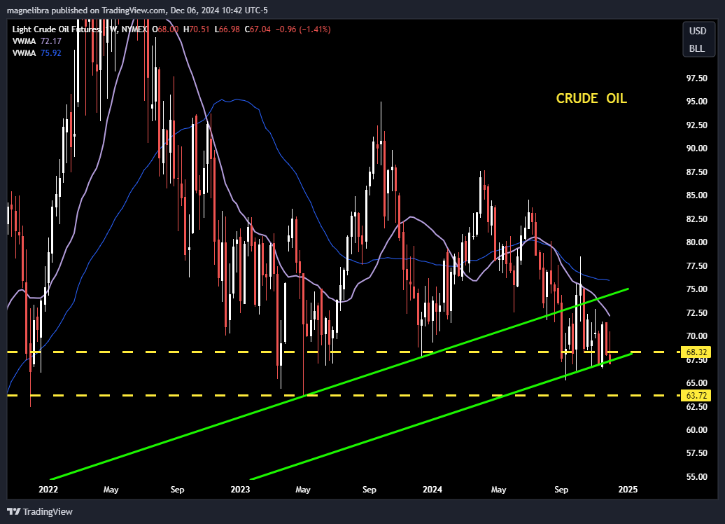 As far as other futures markets, we are watching Crude Oil, its telling us the worlds engines are slowing down and a weekly close under $67 would be disastrous technically: