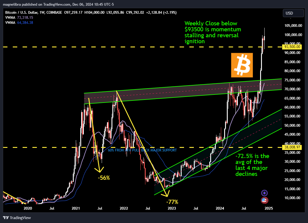 As far as Bitcoin, we saw massive levered liquidations late yesterday driving BTC down from $104k to $92k but has since recovered, $93500 is still our weekly support level: