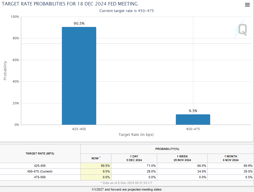 Today’s employment report showed that the unemployment rate rose from 4.1% to 4.2%, and above the 4.1% estimate. The Establishment report showed a gain of 227K, however the household survey fell by 355K to 161.141 million. Those are the key numbers and have led to a spike in the rate cut probability today to 91% for a 4.25-4.50 Fed Funds rate 25bp cut on Dec. 18th.