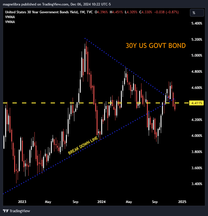 As far as the bond market reaction, pretty muted, but the 30Y chart is pointing to lower rates ahead: