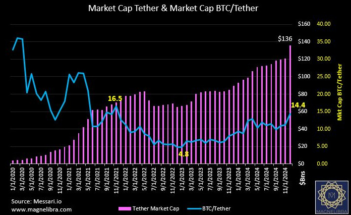 Alright let’s look at another data point, this time involving Tether, which has seen a hefty 3208% jump in market cap since 2019 now up to $135Bn. Bitcoin market cap is up only 1357.7%. The Bitcoin to Tether market cap ratio is 14.4x now the last time it was this high was the Sept to November 2021 time frame. Over the next year Bitcoin fell from a high of $69,000 to a low of $15,460 a downdraft of 76%!