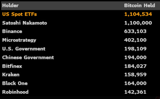 As far as the Wall Streetization of Bitcoin, well it continues as the ETF holders are now up to 1.1m or $110.5Bn worth: