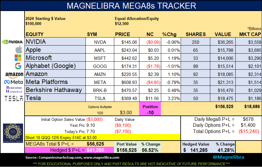 OK on to the settles from yesterday and the MEGA8s where our options position is eating up nearly half of the recent up move, but that is ok, we are subject at times to sacrificing in order to be protected and everyone has a different way to play this game, this is just one way that we are showing:
