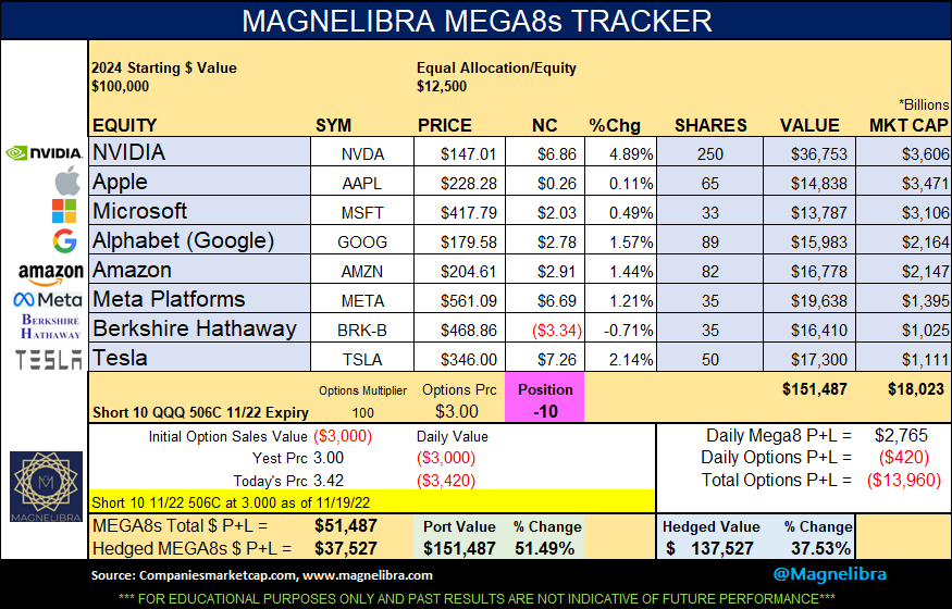 Ok well we leave you with yesterdays MEGA8s and settlements. For now we have the basket hedge on it is the QQQ 506 Call for this Friday. Hope you guys are understanding the concepts that we are providing and we hope you continue to improve and refine your game, Nvidia and Tesla the big winners yesterday: