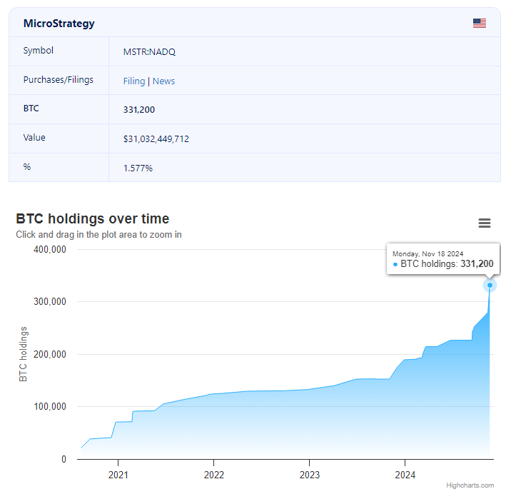 As of 11/11/2024 MicroStrategy owned 331,200 BTC with a total value at $93k per BTC of $30.8 Billion dollars: