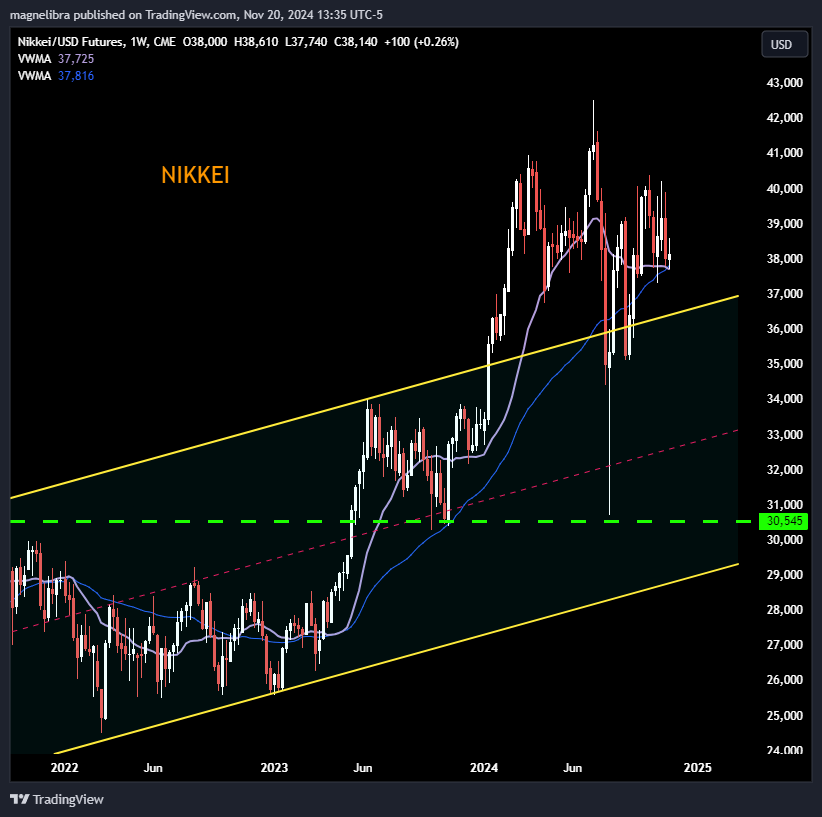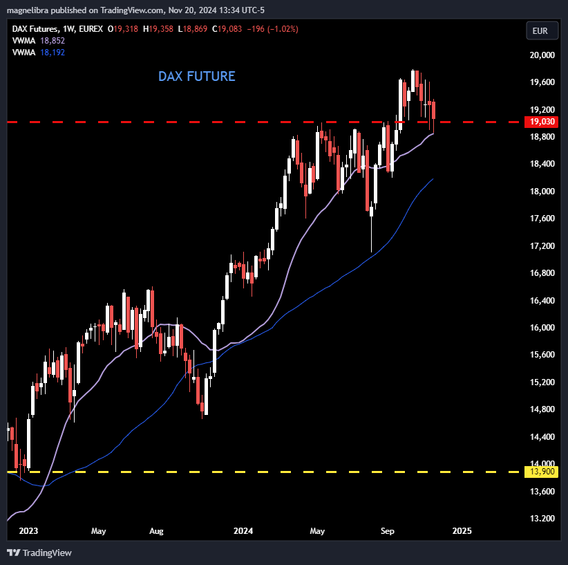 I just wanted to throw out here the picture of the December Dax Futures, we know all the capital is on the US markets, but this thing seems like its at the beginning stages of a full breakdown. The weekly chart looks disastrous and the 21p VWMA was the only thing that saved it so far, so guys keep an eye out on this thing: