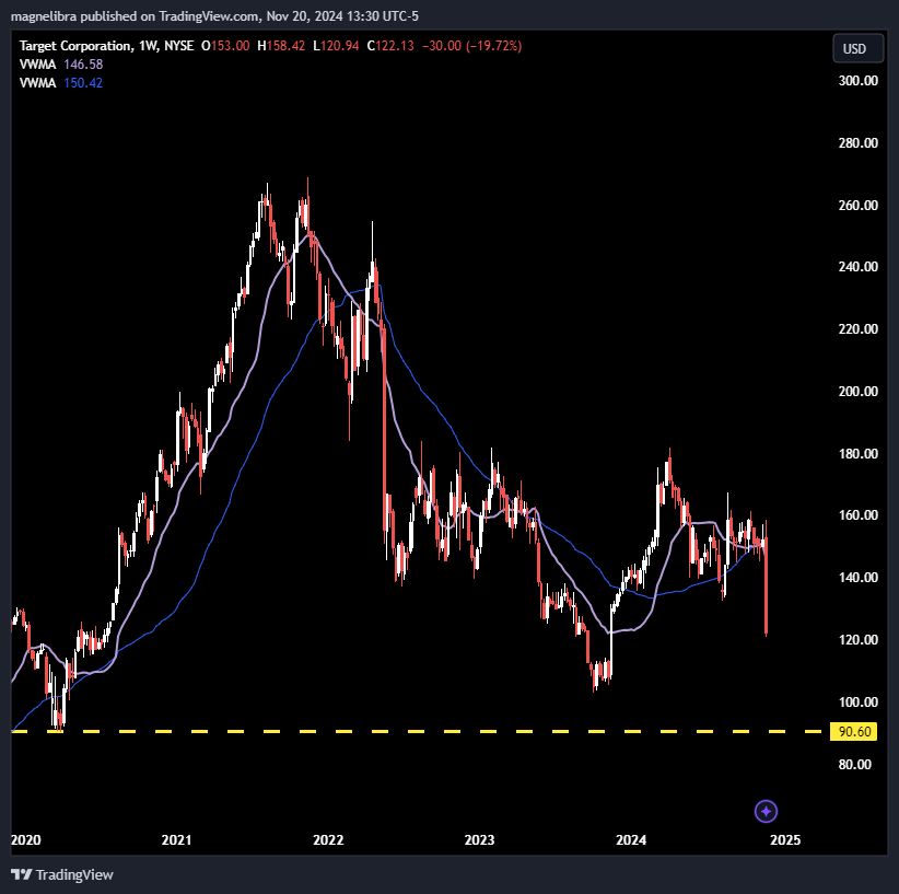 Target came out earlier today with disappointing comparable sales and gross margin numbers. Target CEO noted lower discretionary demand and cost pressures has caused them to revise guidance back down from last quarter. Target is down some -55% from its ATHs back in late 2021 and its down -21.75% on the day. Target is trading $122.20 nearly -$30 on the day. $91 seems like the logical support here now and the likely major target: