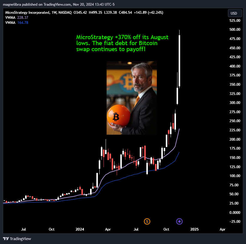 Bitcoin continues to benefit from all the Wall Street retail inflow. Also MicroStrategy issued a massive convertible note security at 0% mind you, some $2.6 Billion borrowed with the convertible senior notes due in 2029 with an initial conversion price of $672.40 per share. Currently MicroStrategy is +370% since its August lows now trading $483 +42% this week alone!