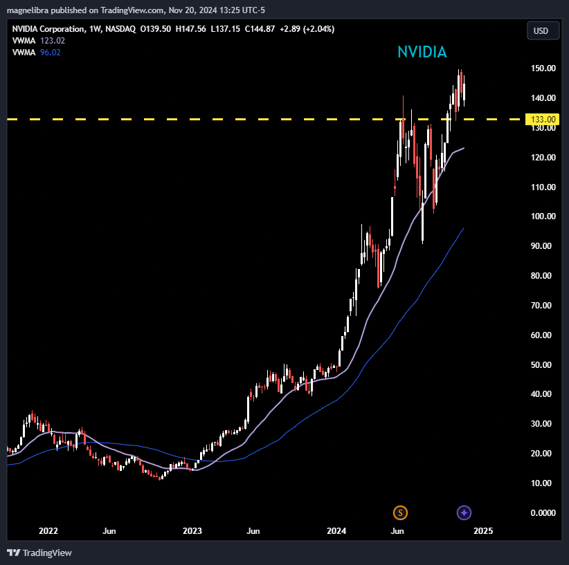 Here is the current chart of Nvidia, its up 60% since August 19th lows, $133 will be our longer term high line in the sand, meaning bulls want to stay above this area on the weekly charts, with $123 initial VWMA support: