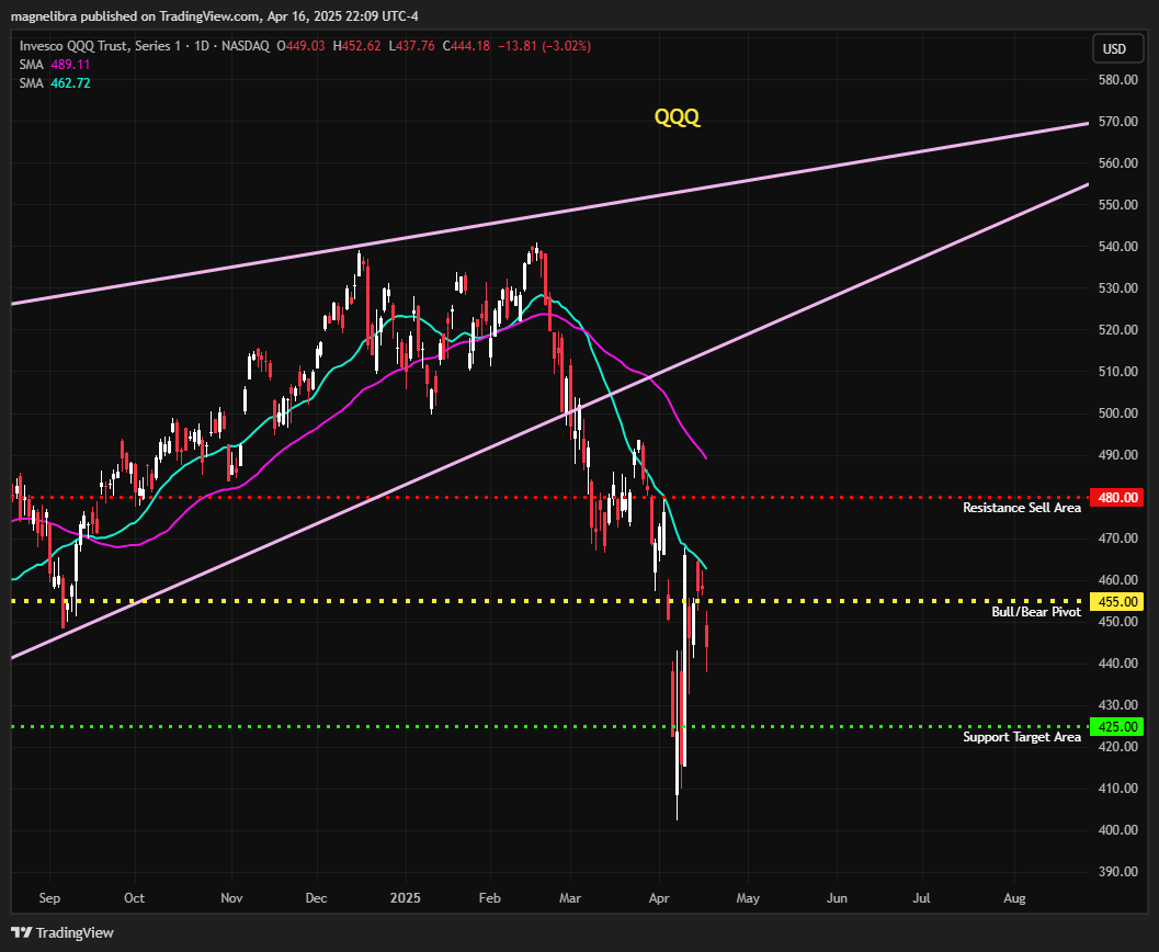 Ok as far as the QQQ ETF 455 is the pivot now and we will continue to see lower prints below this level, support is down at 425: