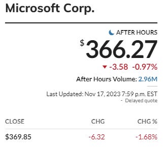 The other big news over the weekend was the ousting of ChatGPT CEO Sam Altman fired by OpenAI citing that the boards “no longer confident in his ability to lead OpenAI.” We believe there is way more to this story, in fact after Altman went in front of Congress ChatGPT definitely made some changes and if we noticed, others certainly did as well. So this story is continuing to develop and for now Microsoft is trading down in after hours:
