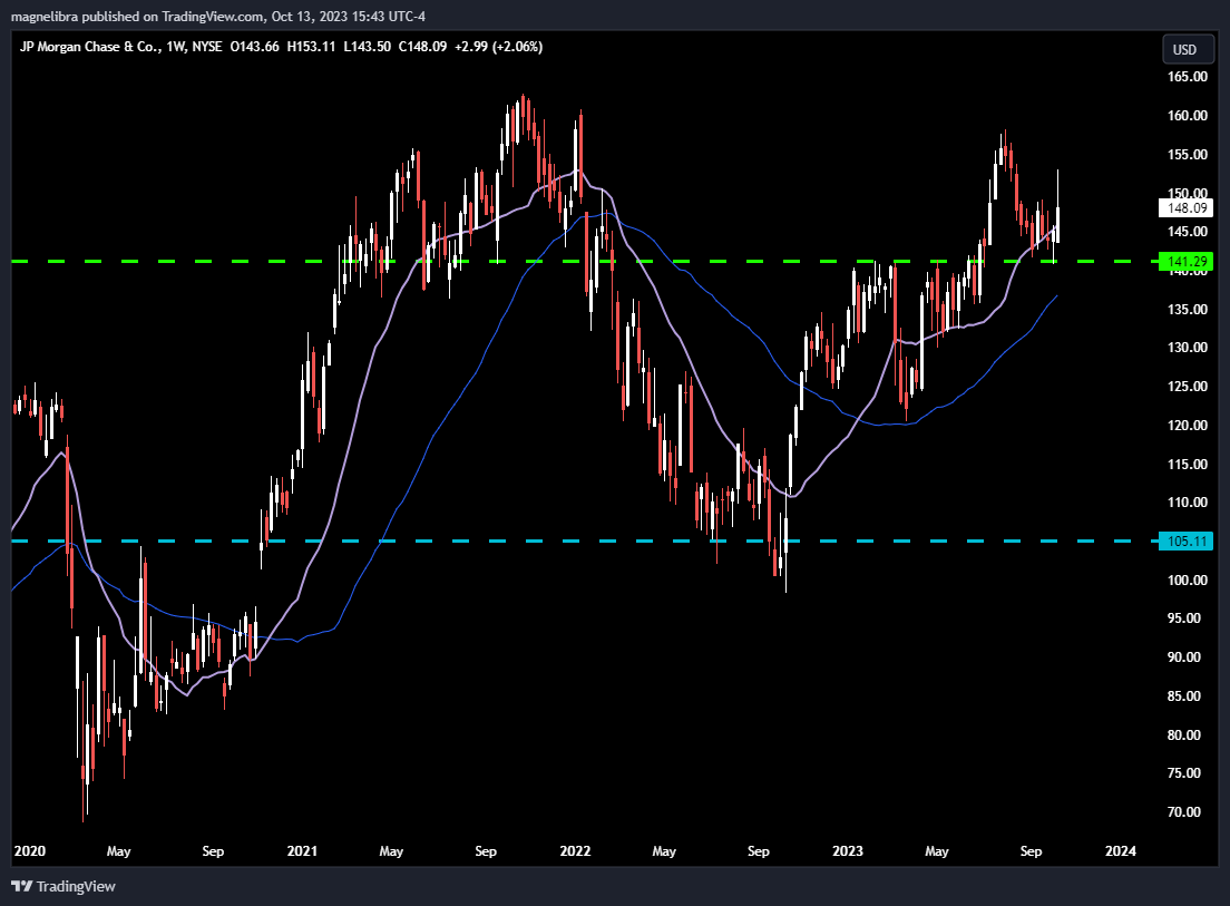 We have a slew of bank earnings today JPM, WFC and Citibank all beating estimates, which really shouldn’t be a surprise as the big banks harbor all the deposits and we know they are making a ton of interest given the level of rates. When we look at JPM their Q3 Net Interest Income was up 30% YoY to $22.9Bn, I guess it pays to invest in higher yields and charge higher rates, all the while paying out pennies on the dollar to your depositors. In a world where credit card rates average is at its highest levels ever at 21%, JPM enjoys paying out on average 2.53%, so higher rates seem to be benefit the big bank. JPM is currently +$2.96 (2.04%) but still struggling with the $150 area: