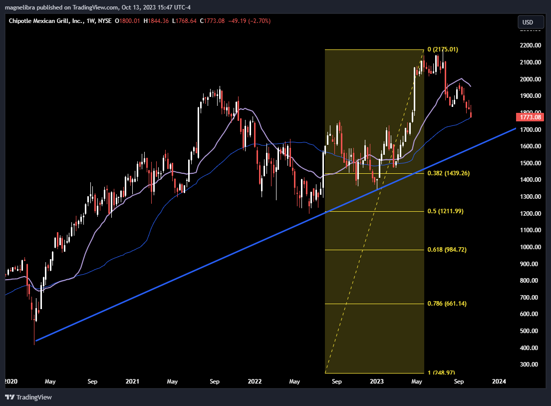 Another stock we watch is Chipotle and we have seen an attempt to raise prices here in the short term to boost profits will end up failing miserably and we believe the equity will continue to suffer and a breach of $1772 should lead to an attack on the $1700 longer term topping level. Should that give way, well, a major slide would indicate a move to $1000: