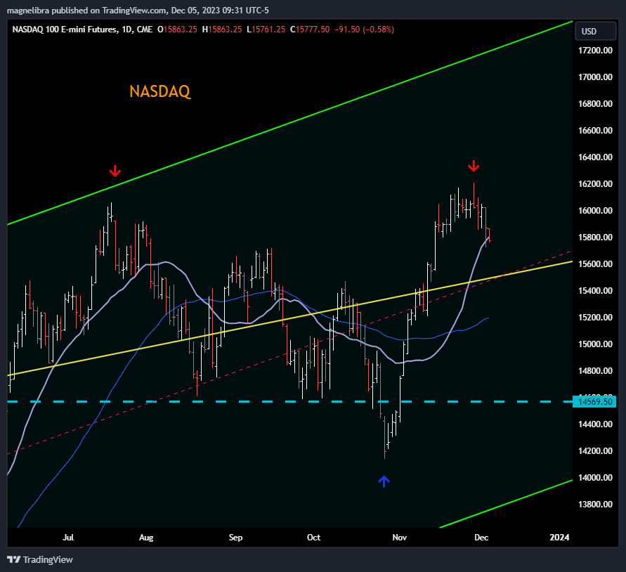 After a week of consolidation on the highs and after quite a dramatic systematic run up in equities, things are looking quite different now. The complete alpha control systematic algo, run by who knows who, took the Nasdaq and SP500 (dragging the Dow and R2k) straight up from Oct 26th till Nov. 23rd. Then we saw about a weeks worth of consolidation and then finally a new high on Nov. 29th where the Nasdaq futures breached the 16200 level and the SP500 hit 4600, actually putting in a higher high on Dec. 1.