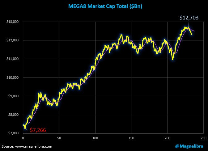 We continue to watch the MEGA8s as the technical setup there on the market cap chart of the group is not good. This has the looks of an ominous 3 peaks and doomed house set up which would drop this thing below $11T in short order. So we would like to see some consolidation or the risk is a continued sell off and diversification out of this grouping: