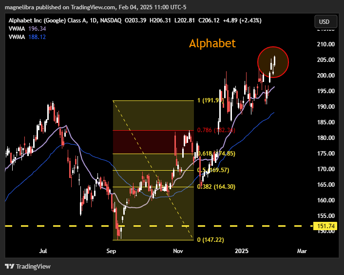Today we have Alphabet earnings after the close, so lets take a look at the BreakEven options straddle pricing a 6.5% move as the $205 straddle is $13.45. Market makers would most likely be targeting the $195 area in our opinion. However when we look at the chart the buyers have been steady once we traded back above the 21VWMA: