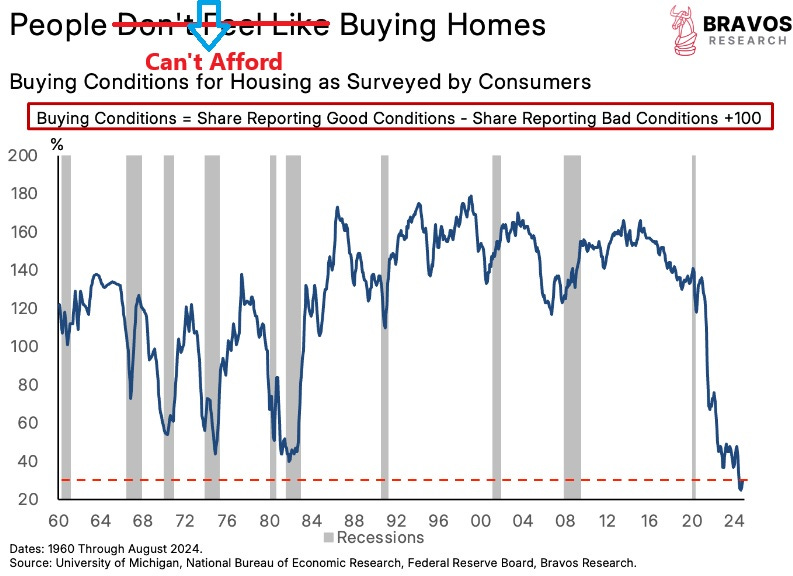 Finally we wanted to share this housing conditions chart from Bravos Research. We changed their title from People Don’t Feel Like Buying Homes, to People Can’t Afford Buying Homes: