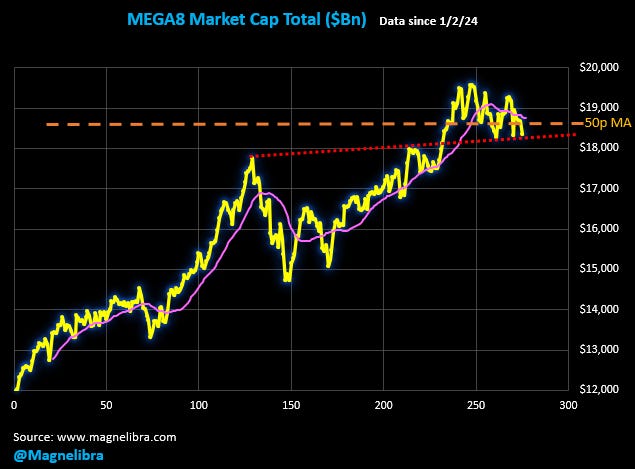 When we look at the MEGA8s Tesla was the biggest loser followed by Apple and META was the star of the day. We will continue to target that 530 QQQ strike as the hedge, but market is a bit away from there so far: