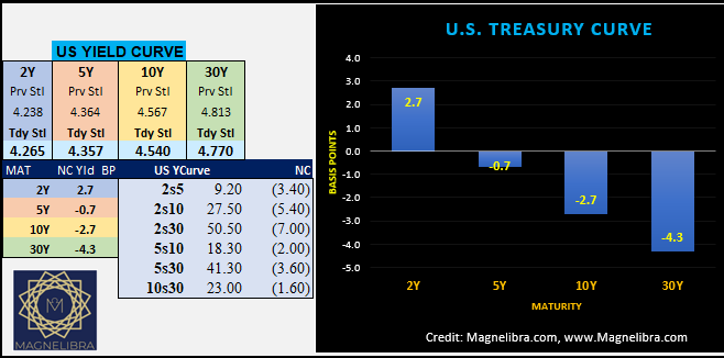 As far as the US Bond market yesterday, we saw the long end outperform falling 4.3bp while the 2Y gained 2.7bp a nice flattening of the yield curve. Next week we will see auctions of new 10s and 30s: