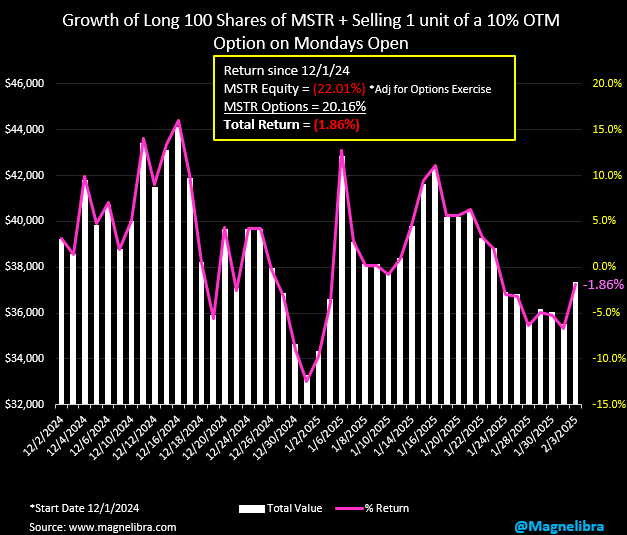 As far as MicroStrategy which reports earnings tomorrow, the call selling strategy continues to hover at a small loss. This weeks call short for our tracker is the $360 call: