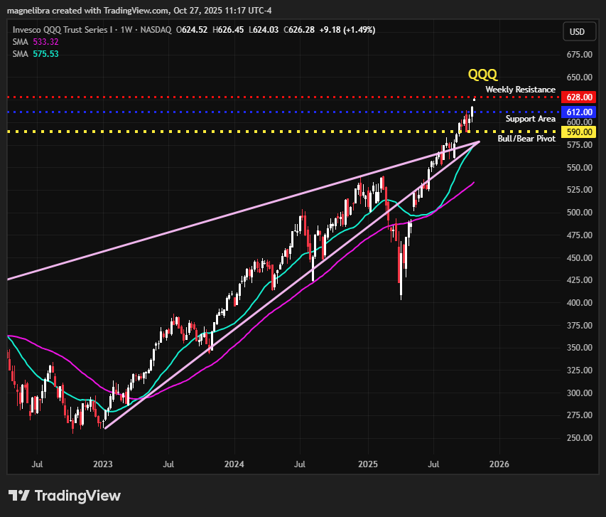 As far as some technical charts, let’s start off with the QQQ ETF, the market is close to its resistance for the week, which stands at 628 as of the trade this morning its trading 626: