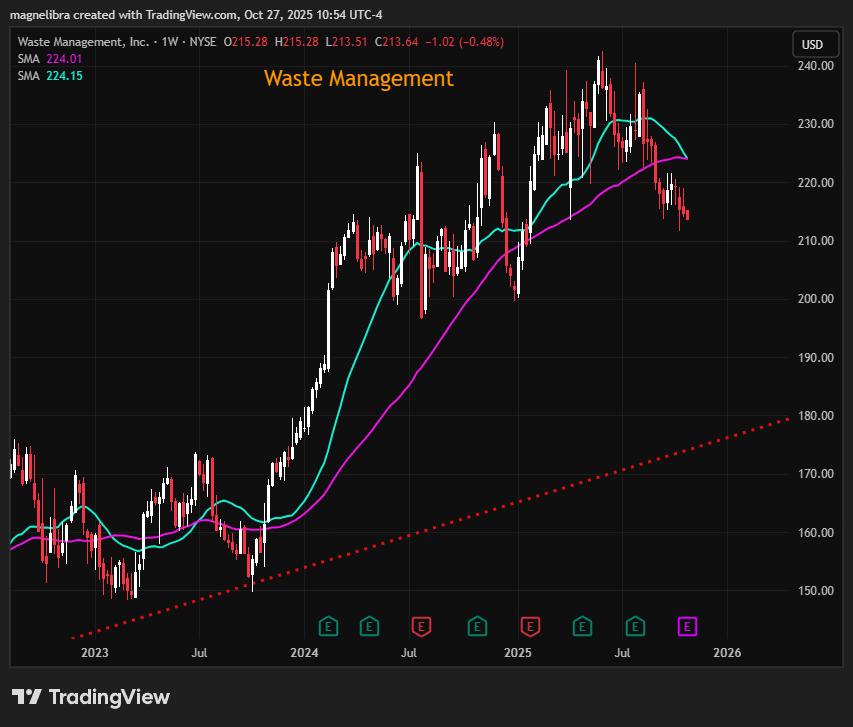 Ok so what do we have on tap this week besides the FOMC decision on Wednesday, let’s take a quick look at the earnings front. Today after the close we have Waste Management, a stellar performer over the years, but has struggled with the $235 level. It wouldn’t surprise us to see a move back up above $220 here given the proximity of the 21/50 period MA about to cross: