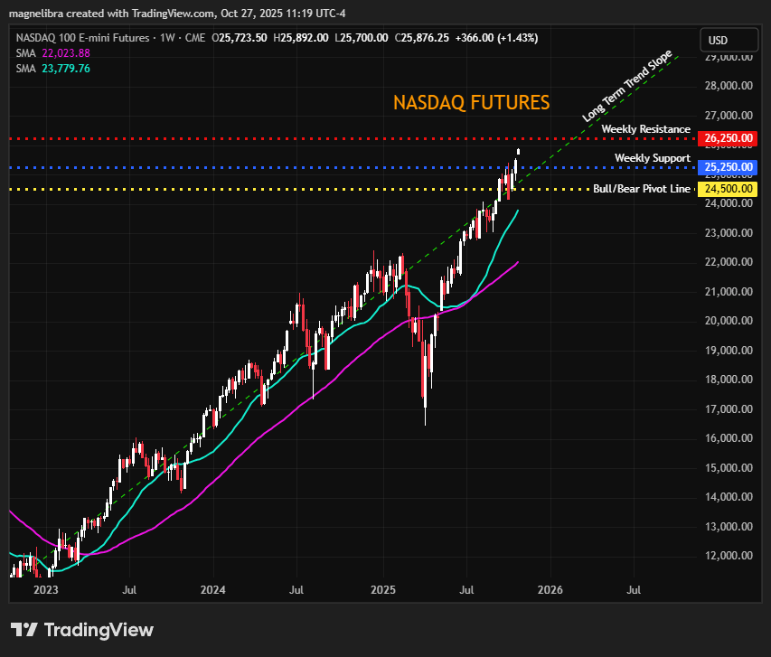 As far as the Nasdaq and SP500 futures technical areas of interest, the Nasdaq resistance on the week is 26250 with support down at 25250 and the bull/bear flip zone of 24500: