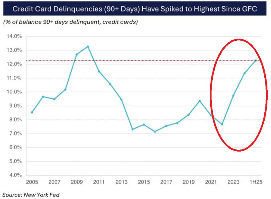 We also know the absolute destruction in the underlying economy that is ongoing, and a recent NYFED data point highlights this, how about a 58% increase in 90+ Days Credit Card Delinquencies since 2022: