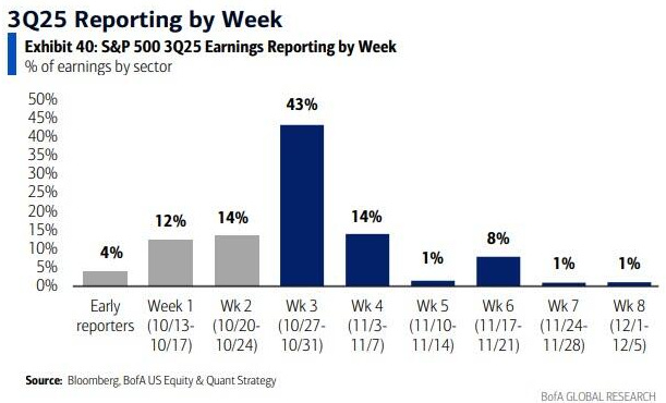 What a week we have ahead of us, as the companies that represent some 43% of the total earnings in the SP500 are set to report. This week is also highlighted by the FOMC rate decision on Wednesday. The FOMC is widely expected to cut the Federal Funds rate by 25bp moving the range down to 3.75%-4.00%. The YoY CPI at 3% is not a hindrance whatsoever as the deteriorating job picture is more the focus especially the paltry 28k avg. monthly job gain over the last few months. Yes we know the stock markets continue to press into higher and higher new highs, but once again, you know they do not reflect the overall economic viability of our nation. The economic forecasting via equity prices was supplanted long ago and is now merely a reflection of both debasement in debt fiat money and more so the cash hoarding capacities of the top 10% crowd, more particularly the top 1%.