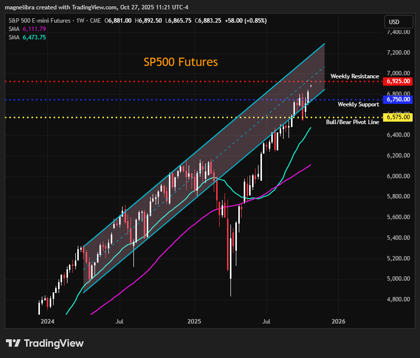 The SP500 weekly resistance is at 6925, support 6750 with the pivot flip area of 6575: