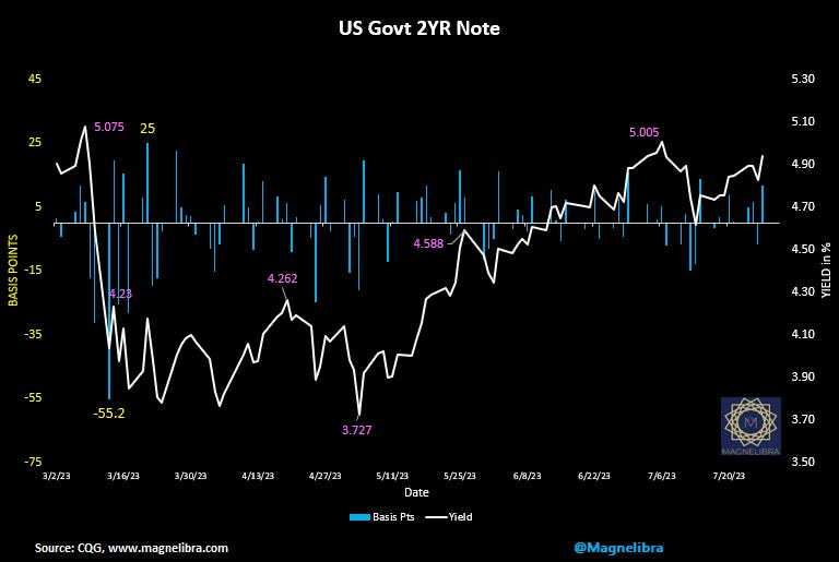 The US Bond market was already under fire most of the trading day after the GDP and Durable goods numbers then the BOJ news! The Q2 GDP came in at 2.4% exp 2.0% and DG Orders were +4.7% exp 1.5%. This crushed the US equity markets and the ECB Hike coupled with the BOJ news that was leaked out put a quick lid on risk assets and the US dollar soared: