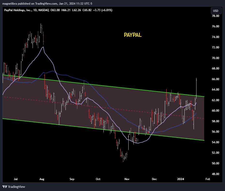 Alight so the fundamentals are very good here for PayPal, how about the technicals? Well look at this basing and breakout on the daily chart. What we like about this technical formation is the basing pattern breakout to the lows down at $50 the trade back into the basing channel which is layered between $63 and $55 and now the break out above trading $65.82 currently: