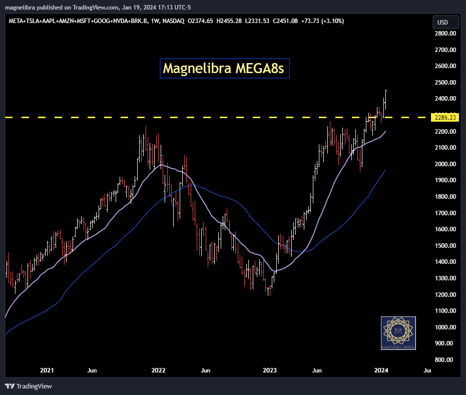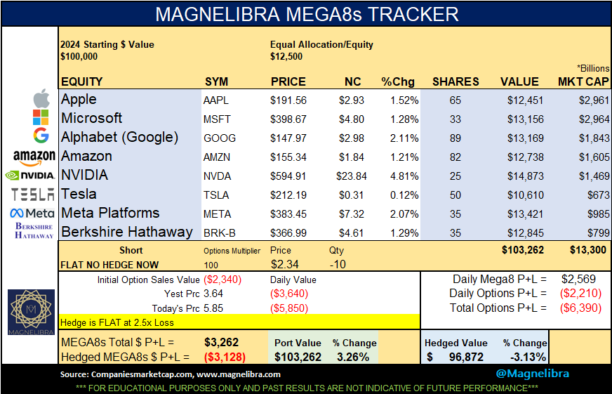 When we look at the MEGA8s over $226 Bn in market cap added to this group Friday as the systematic buy programs are ramping up and sticking with the concentration of capital theme, as if the deniers who had thought 2023 was going to be a down year are starting out 2024 kinda like fool me once shame on you fool me twice shame on me and they are not going to miss out this time around! Once again Nvidia the big kid on the block +$23.84 or 4.81%!