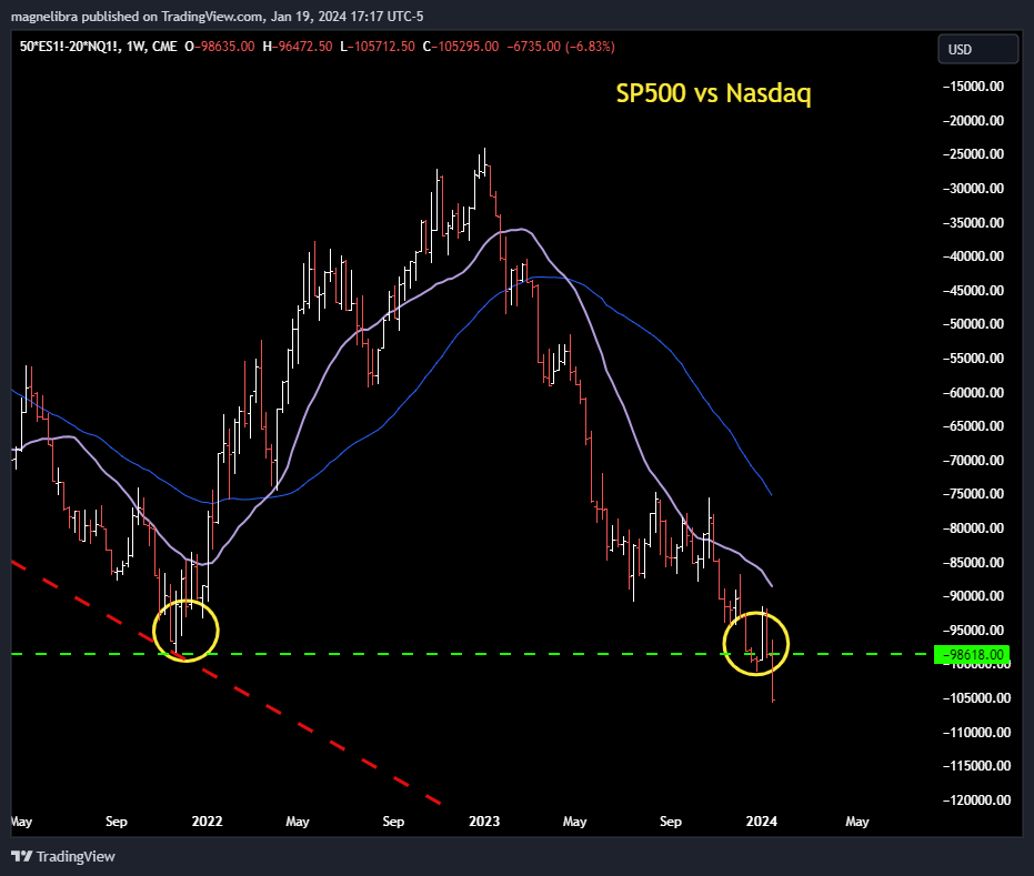 It will be amazing to see if the liquidation of the RRP which is now down to $625bn will continue to see outflows turn into risk on inflows. We also know the BTFP program continues to see a greater uptake in the program now $154Bn +9Bn last week. We also know China has laid down the gauntlet and brokers there have basically suspended any short selling in stocks there. When we look at these two in our spread format the SP500 vs Nasdaq is now breaking out lower again, which is leading toward the continuation of the concentration of wealth into tech: