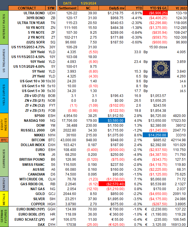 Let’s take a look at the Magnelibra Settlement page to see where everything settled out on the day here. The US treasuries were well bid across the board with a nice parallel shift across the maturity spectrum as both the 10Y and 5Y were both down nearly 7bp on the day. The equities were led by the Nasdaq and Russell2k +179 points and 34.30 respectively with the SP finishing +38.25 points on the day. Bitcoin has rebounded from the $38k level to $43k once again and the Dollar was weaker across the board except against the Euro and Pound. Energy weaker across the board as well with metals posting a solid day with silver up nearly 38 cents:
