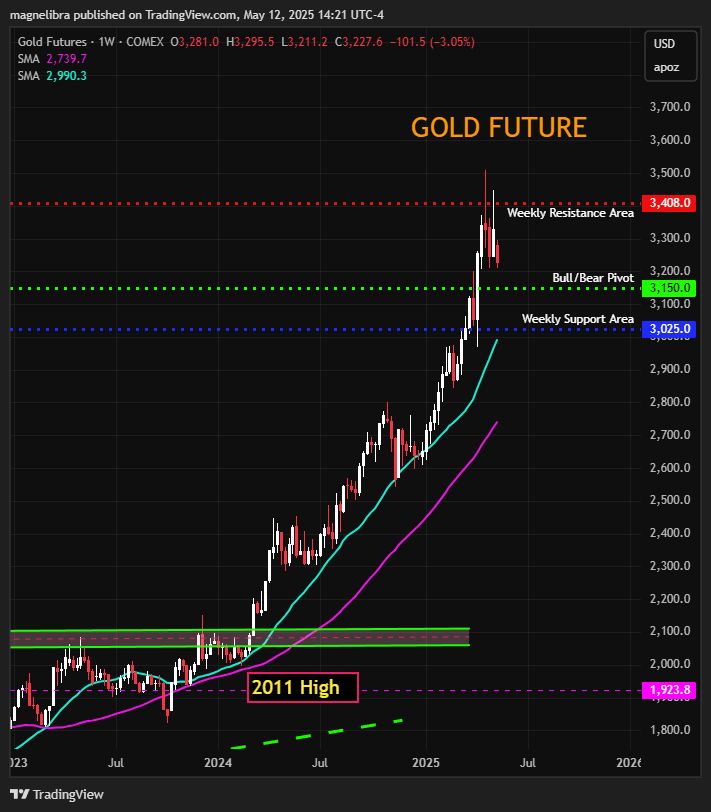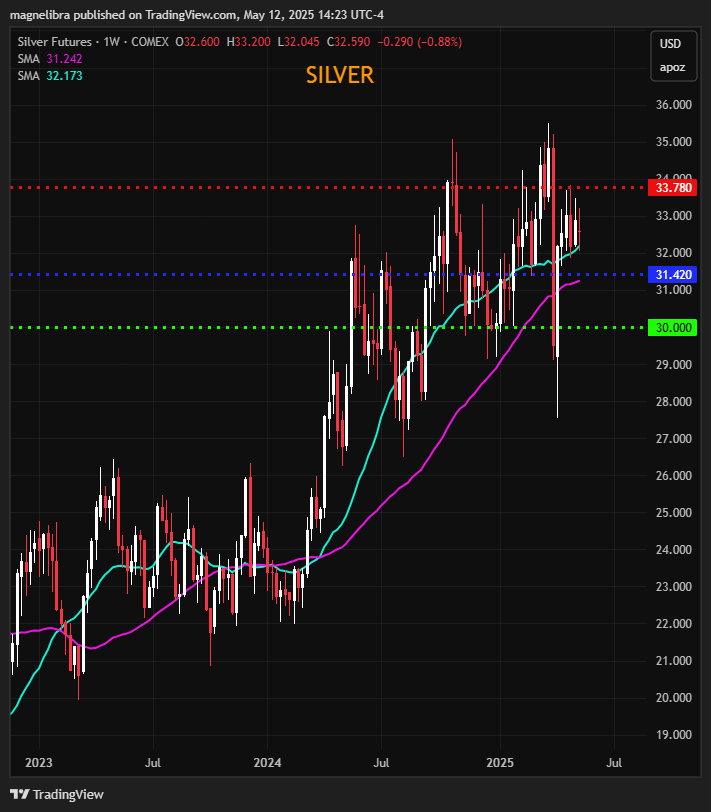 As far as Silver futures, we can’t help but think this topping pattern which has the $30 area as the key for now is still up for grabs. We know that Silver is undervalued vs Gold historically here and we may start to see Silver hold up better than gold here if we do indeed start to pull back. Just to put silver into perspective the $32.50 area is exactly where it was one year ago. Compare this to Gold, where last May it was trading $2350 and now its $3240!