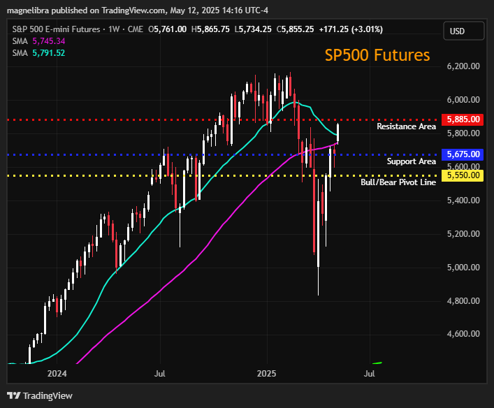 When we look at the SP500 futures, we have moved our resistance target this week up to 5885 and our support areas now at 5675. We don’t anticipate this higher trend to reverse unless we start to see a close underneath our pivot level of 5550: