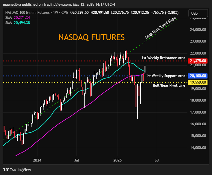 As far as the Nasdaq futures the resistance is now at 21375 and 20100 is the support and this will not flip negative till we trade below 19550. You can see the long term trend slope line that the bulls are targeting once again :