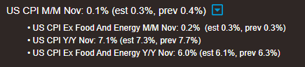 CPI 0.1% MoM Risk SoarsMike AgneDec 13, 2022∙ PaidShareA bit off the highs of the session right now as US markets open here post CPI which came in below estimates at 0.1% (est 0.3% MoM):Source: LivesquawkContinue reading this post for free, courtesy of Mike Agne.Claim my free postOr purchase a paid subscription.PreviousNext