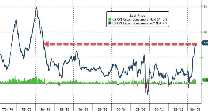 Headline CPI came in at +7.9% YoY. This is the highest YoY since Jan 1982, here is the chart courtesy of Bloomberg: