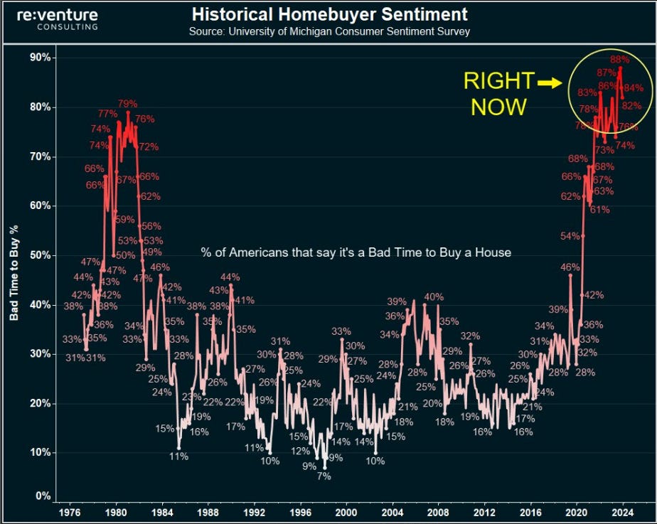 Look at this chart from at nickgerli1 on X, historical pessimism and rightfully so, the only difference is the late 70s had 20% interest rates not 7%, which tells you all you need to know about actual affordability, its abysmal, in fact it tells us that 7% is equal to 20% back then and the FOMC is dead on keeping rates right here for now: