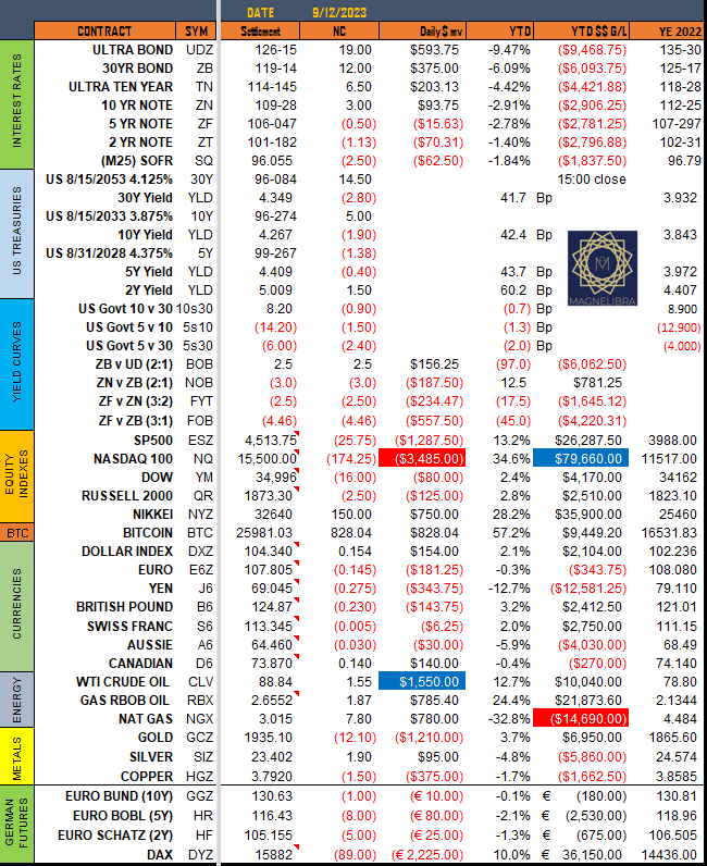 The markets today took away yesterdays run up in equities and the Nasdaq was today’s biggest loser. When we look at the settlements today, notice we have rolled the equities and currencies to December: