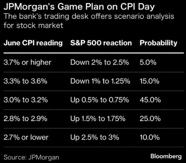 So the yield curve took a breather today and its seems equities are geared up for a Sub 3.1% CPI print. As far as expectations tomorrow, here is the JPM take on what happens per a given result: