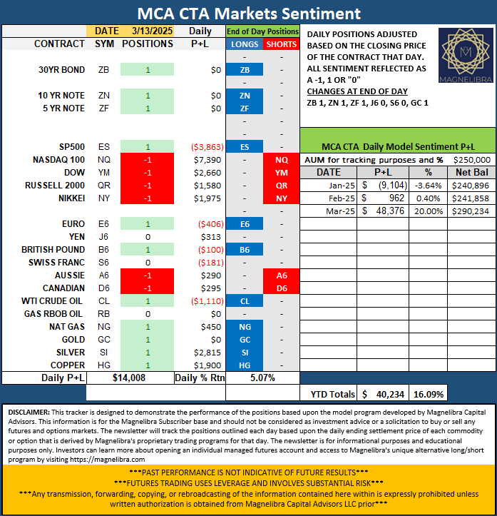 DISCLAIMER: For educational purposes only. This is not a solicitation to buy or sell commodity futures or options. The risk of trading securities, futures and options can be substantial and is not for everyone. Such investments may not be appropriate for the recipient. The valuation of futures and options may fluctuate, and, as a result, clients may lose more than their original investment. Nothing contained in this message may be construed as an express or an implied promise, guarantee or implication by, of or from Magnelibra Capital Advisors. Magnelibra the Commodity Trading Advisory and its proprietary long/short commodities, futures and options managed accounts may hold long and or short positions in the various futures and markets that Magnelibra covers. We will never claim that you will profit or that losses can or will be limited in any manner whatsoever. Past performance is not necessarily indicative of future results. Although care has been taken to assure the accuracy, completeness and reliability of the information contained herein, we make no warranty, express or implied, or assume any legal liability or responsibility for the accuracy, completeness, reliability or usefulness of any information, product, service or process disclosed.