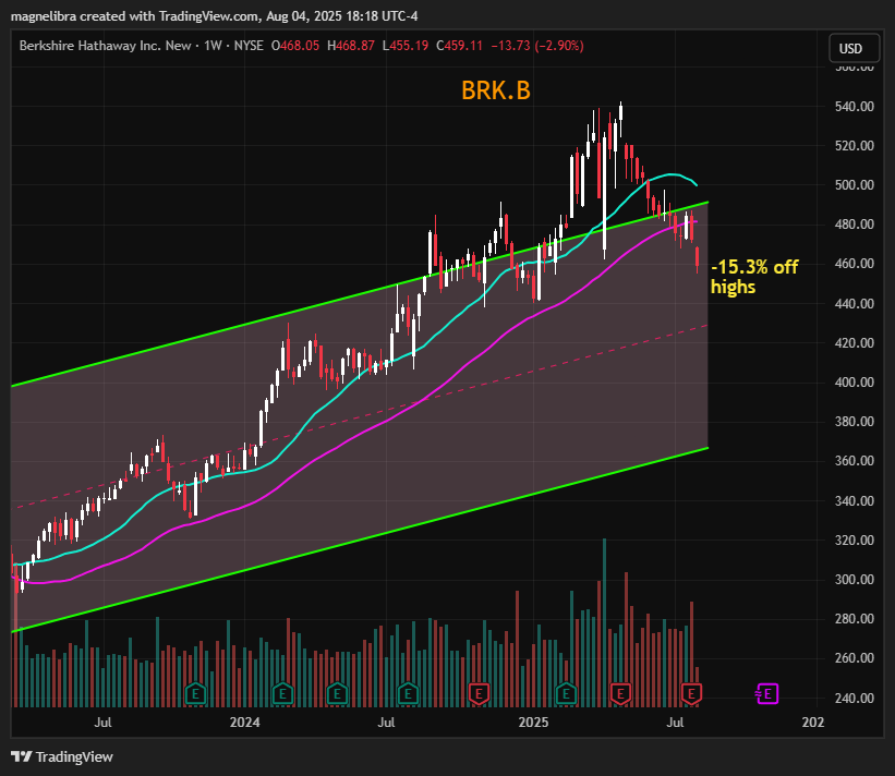 Well the big news on top of the equity bounce back today is the massive $3.76Bn write-down that hit Berkshire today as it finished -2.9% on the day falling $13.73 and now some 15.3% off the highs and firmly back inside its up trend channel: