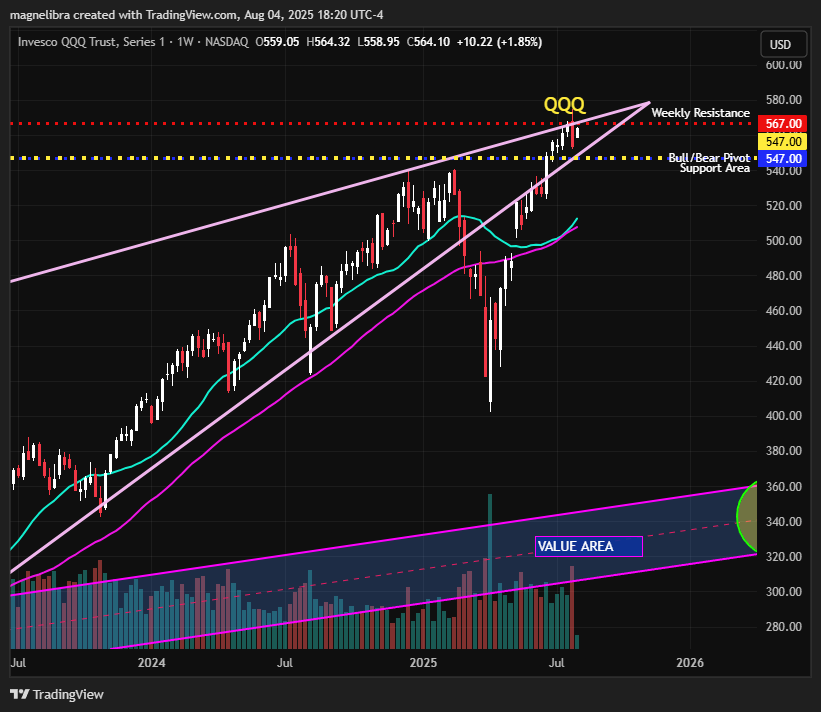 We talked about watching the QQQ this week as it will either fully confirm or simply move more subtly in the sell side direction. We move this weeks resistance at 567 and the support on the weekly is also the bull/bear pivot at 547. Today the QQQ put in a good day +10.22 to 564.10 and just a few points short of our weekly resistance: