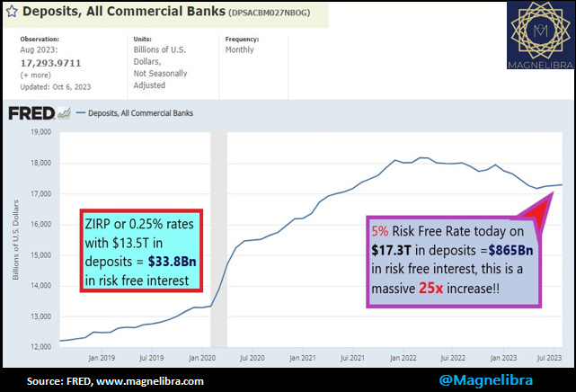 One point we did want to make today is the fact that higher rates, if they are indeed here for the next 8 months or so (first rate cut is not expected till June 2024) it seems that the yield pick up on the risk free rate is a massive stimulus for many cash stashed, investors, corps, pension funds and insurers. We have said it before that higher rates now, in today’s economy lead to increased inflation via the risk free interest take up mechanism. In order to demonstrate this, let us present this chart below: