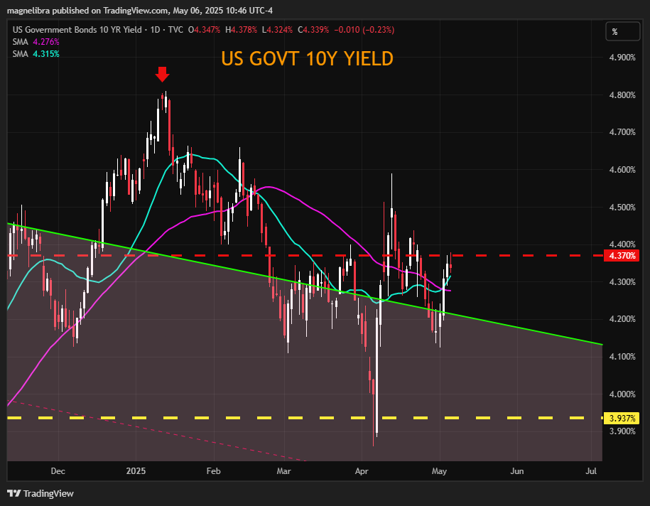 We believe the FOMC can be patient here with rates and we also believe they believe the risks are tilted toward a slow down and not an acceleration in inflation expectations. As far as our US Govt 10yr yield chart the 4.37% area still remains sticky: