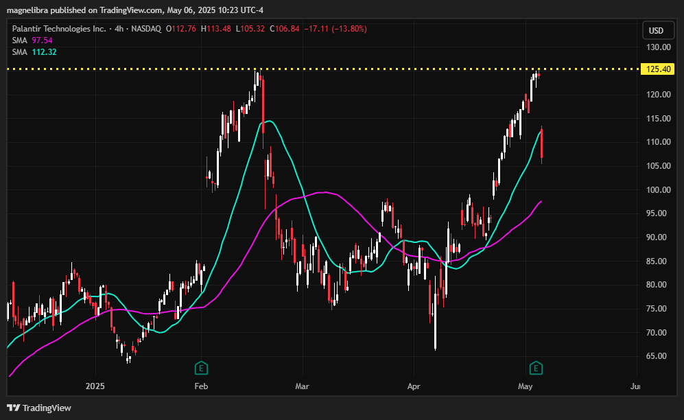 Palantir Tech. is taking it on the chin today as earnings were in line, but the market is discounting their ability to keep up its valuation. Palantir is down almost 14% to $106.84, -$16.93 on the day. Its interesting to note there was massive call interest at $125 strike and well, those are worthless now and once again Palantir is backing off from the same level it did back in February: